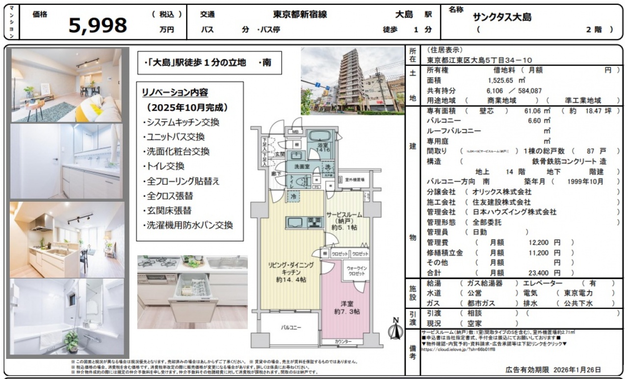 物件情報と現況に差異がある場合、現況を優先します。 掲載物件は売却済み、売却中止、価格変更となる場合がありますので、予めご了承ください。 仲介物件には所定の仲介手数料(消費税含む)が必要です。