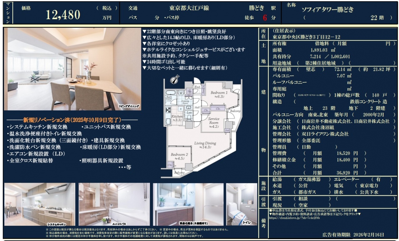 物件情報と現況に差異がある場合、現況を優先します。 掲載物件は売却済み、売却中止、価格変更となる場合がありますので、予めご了承ください。 仲介物件には所定の仲介手数料(消費税含む)が必要です。