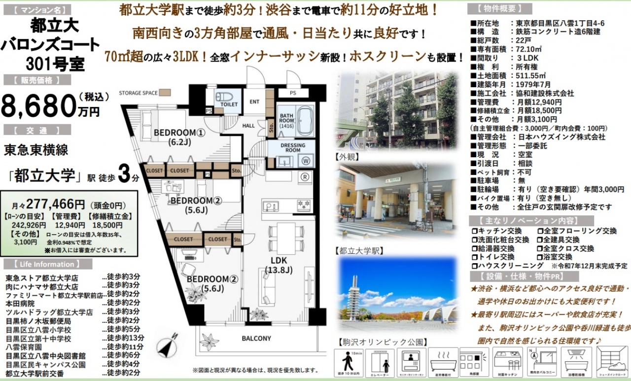 物件情報と現況に差異がある場合、現況を優先します。 掲載物件は売却済み、売却中止、価格変更となる場合がありますので、予めご了承ください。 仲介物件には所定の仲介手数料(消費税含む)が必要です。