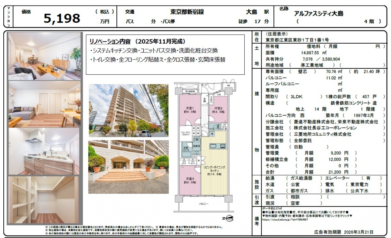 物件情報と現況に差異がある場合、現況を優先します。 掲載物件は売却済み、売却中止、価格変更となる場合がありますので、予めご了承ください。 仲介物件には所定の仲介手数料(消費税含む)が必要です。