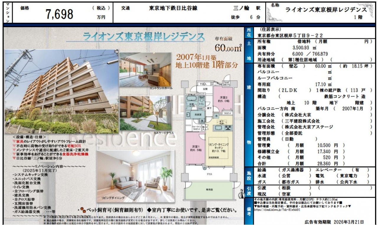 東京都 不動産 > ライオンズ東京根岸レジデンス