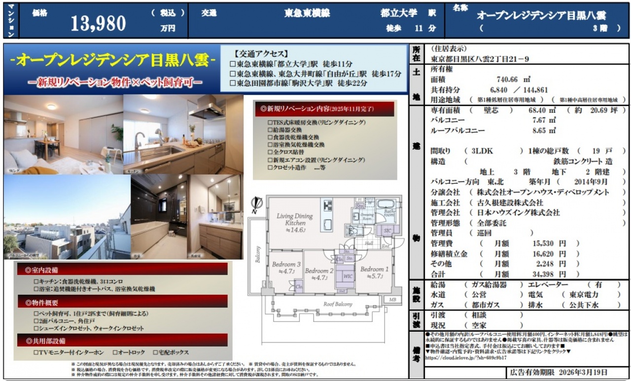 東京都 不動産 > オープンレジデンシア目黒八雲