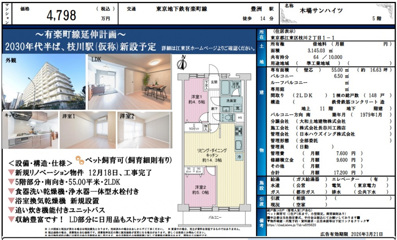 物件情報と現況に差異がある場合、現況を優先します。 掲載物件は売却済み、売却中止、価格変更となる場合がありますので、予めご了承ください。 仲介物件には所定の仲介手数料(消費税含む)が必要です。