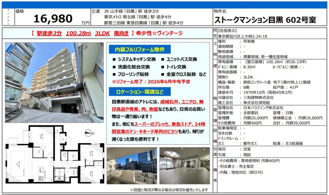 物件情報と現況に差異がある場合、現況を優先します。 掲載物件は売却済み、売却中止、価格変更となる場合がありますので、予めご了承ください。 仲介物件には所定の仲介手数料(消費税含む)が必要です。