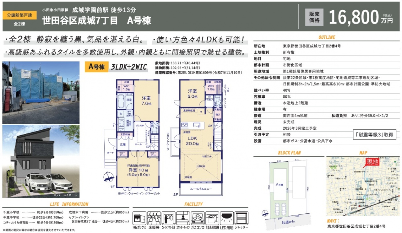 仲介手数料無料の世田谷区 成城7丁目 新築一戸建て情報は東京法務不動産ナビ